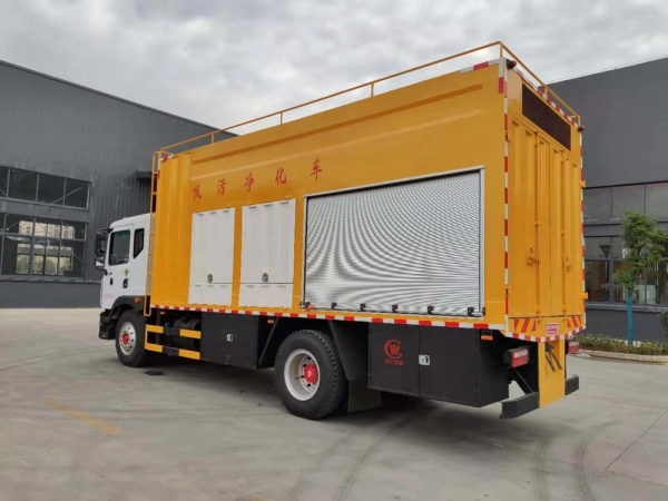 【车辆结构】吸污净化部分:汽车底盘、厢式结构,内部主要固定装置为:发电机、真空泵、排污泵、分离箱、污水箱、加药箱、混凝槽、叠螺机。高压清洗部分:水箱、柱塞泵、液压卷盘组成。