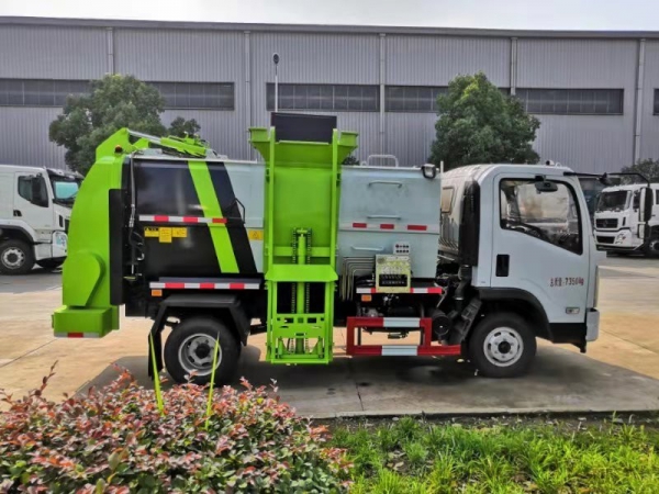 泔水装载由垃圾桶提升系统完成,该系统具有垃圾桶锁止结构,装卸安全可靠。垃圾桶与垃圾投入口衔接好,保证装卸过程中餐厨垃圾不溢撒、不遗漏。垃圾投入口与推板之间有足够距离,推板与罐体内表面设有密封装置,避免餐厨垃圾投入过程及分离过程中溢到推板后方。 液压系统由泵、液压阀和顺序阀以及各种功能的液压油缸、高低压管路组成。关键部件可选用原装进口,保证产品工作可靠、安全。