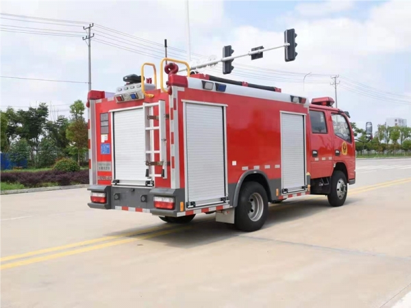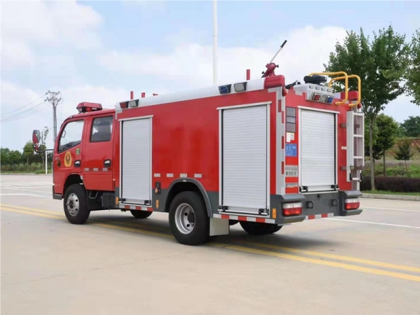 电气配置 | 驾驶室顶部前端为长排100W警报器及警灯,车身后配有24V/60W火场照明灯一只,车辆两侧上方各配有红蓝相配的爆闪灯,下方安装安全标志灯,乘员室、器材箱、 泵房内均装有照明灯,回转警灯开关、通讯设备预备接口。 |