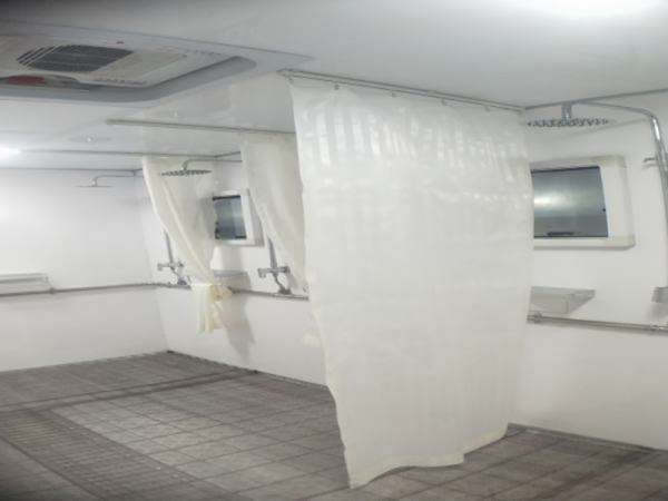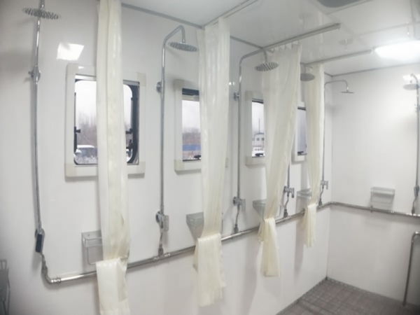 1、车内共有 3 个区域,分别为后更衣区、中淋浴区、锅炉区燃油热水锅炉、不低于2.8KVA 柴油发电机、水泵、精密过滤器、暖风机、灭火器、通风窗、照明灯;淋浴间设置 12 个淋浴喷头、不锈钢水箱、皂盒、通风窗、照明灯;内设要有更衣柜、衣帽钩、照明灯、换气扇等配套设备。(配套设备漏掉*需增加)。