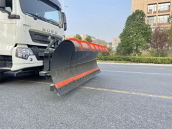 除雪车高速前进时,推雪铲与除雪车行驶方向倾斜±30º,将雪推向除雪车一侧,残雪厚度不大于10mm。四连杆机构分段避障,每段都具有自动避障、自动复位功能,每个小铲板都采用单独的四连杆机构连接在推雪铲横梁上;具有浮动和随路面仿形功能;铲体采用抗弯曲的坚固箱式结构确保高稳定性;保持铲体浮动时,铲刃除雪倾角不变;具有摆角机械限位功能;在提升油缸的上端设有压力传感器,安全保护装置,保护升降油缸不受冲击;独立的液压单元给雪铲的动作油缸提供动力,保护司机视野。雪铲与底盘车连接采用挂板式连接系统;配备独立的控制盒,驾驶员在驾驶室内即可对除雪铲进行各种动作的操作,方便快捷且安全可靠。