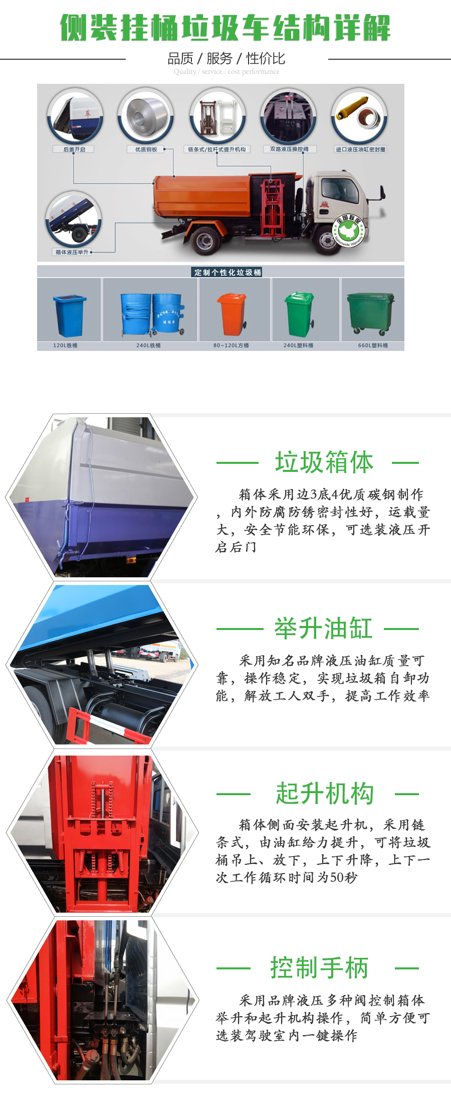 上装配置:箱体采用边三底三碳优质钢板制作,箱体前部侧面带有挂桶提升机构,可自动举升垃圾桶倒入垃圾,带自卸功能,带挂桶提升机翻盖,尾部装有橡胶密封条,防污水滴漏,手电一体操作系统,挂桶垃圾车可根据客户要求搭配120升或240升塑料桶。
