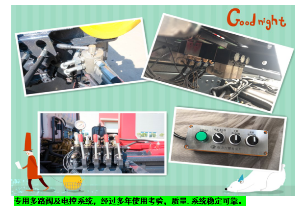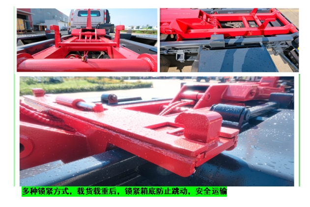 ◇上装配置:强度合金钢一体式主勾臂,加强型副梁,铸钢尾托轮,手自一体室内外液压操控,上装提升能力3000KG, 液压完成上箱+下箱+锁紧+自卸等作业,实现一车配多箱的循环转运。可采用加强型上装,油缸加粗,加装液压支腿,搭配建筑垃圾箱使用,提升能力6000Kg。