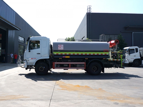 1.具备洒水车所有功能,前冲(喷)后洒,带侧喷花洒,罐体后带工作平台,平台上安装绿化洒水高炮,炮可全方位360°旋转,可连续调成直冲状、大雨、中雨、小雨、毛毛雨,带安全护栏,配备专用大功率洒水泵,泵可抽水排水,吸程≥7m,洒水宽度≥15m,洒水炮射程≥20m,带消防接口和自流阀,随车选装20米绿化卷盘,紧急时可抗旱运水和消防使用。