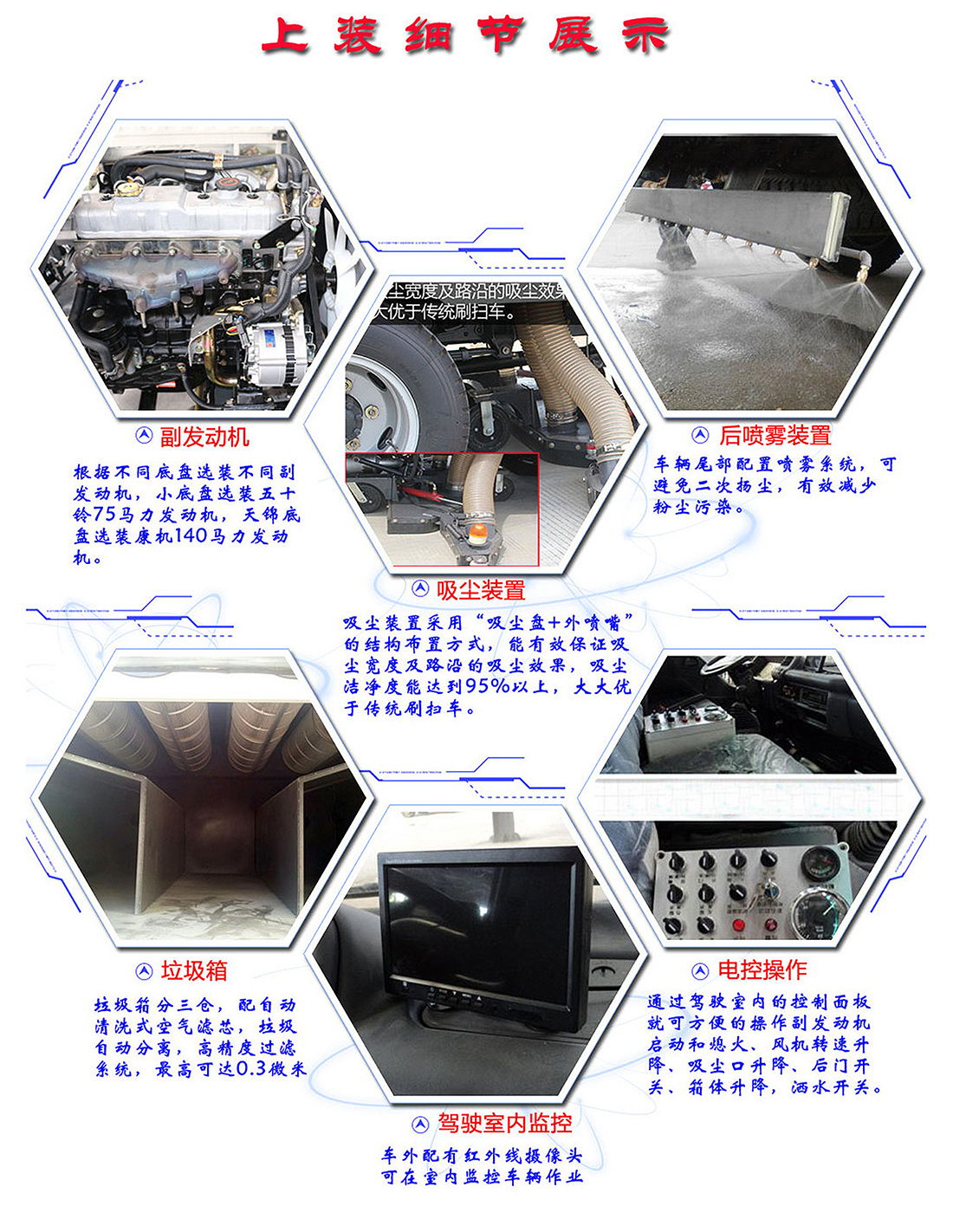 东风天锦10.5方吸尘车专用配置:尘箱:8立方米,水箱:2立方米;中置吸盘、江铃五十铃副发动机、施耐德控制开关、海普瑞斯电磁阀组、无级变速自动离合器、免维护离心式风机、高精度垃圾箱过滤系统(最高可达0.5微米),不锈钢垃圾箱、进口脉冲阀、垃圾箱举升自卸、尾部LED箭头灯、车尾雾状喷水润湿功能、倒车影像、手动泵应急系统。