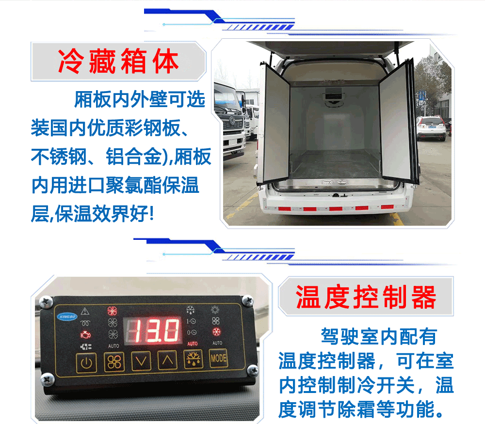 厢体配置:厢体板采用市面上最先进技术-负压加热抽真空技术,保温性能达到国家A级标准厢体。内部尺寸为: 容积为 立方,厢体内外面料采用最新款纳米玻璃钢(不吸光、隔热性好、硬度强、抗氧化)厢体厚度为8.5cm ,内衬骨架为防锈处理优质轻钢型材镀锌管,保温材料为无空隙填充聚氨酯发泡,厢体底部为铝合金花纹板或选平面纳米玻璃钢,厢体采用镀锌不锈钢包角,加厚型铝合金包边,后门框为不锈钢,加厚型不锈钢后门]合页及锁件,全车所有不锈钢部位均使用食品级304不锈钢制造,厢体内部采用ED照明灯及厢体示宽灯。